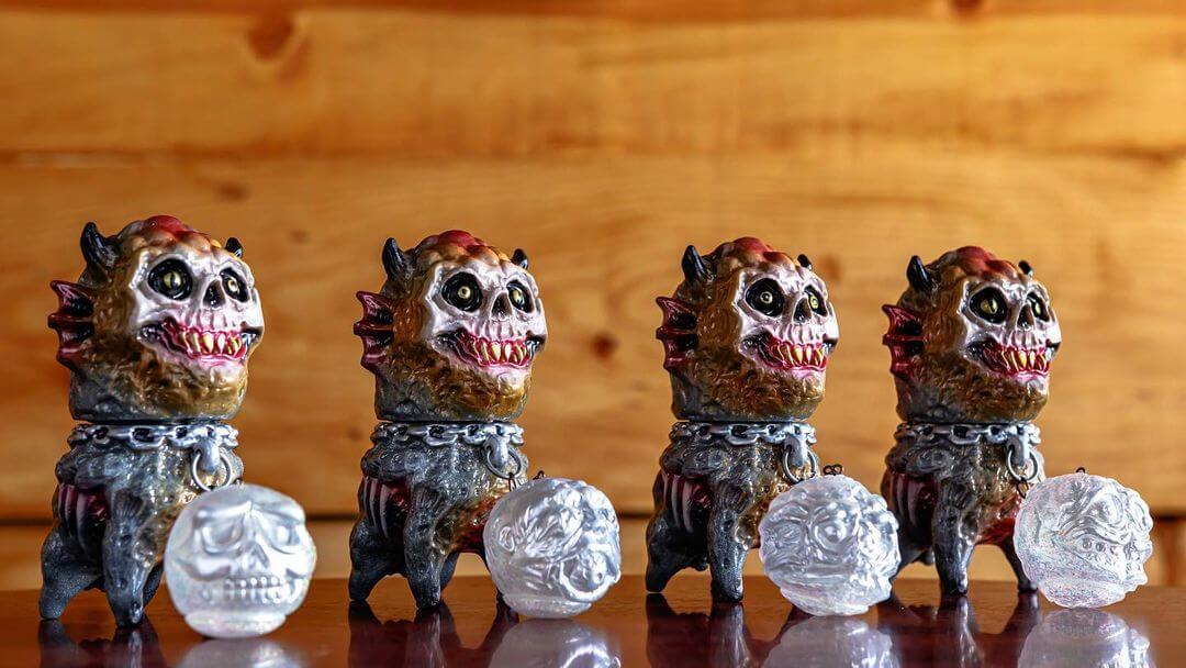The hell hound Aleister Growley kaiju appears in silver with red, black, bronze and bone sprays, painted by Splurrt. Each hound comes ball and chained to its own sparkling Cadaver Ball.