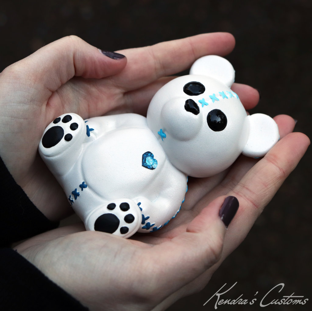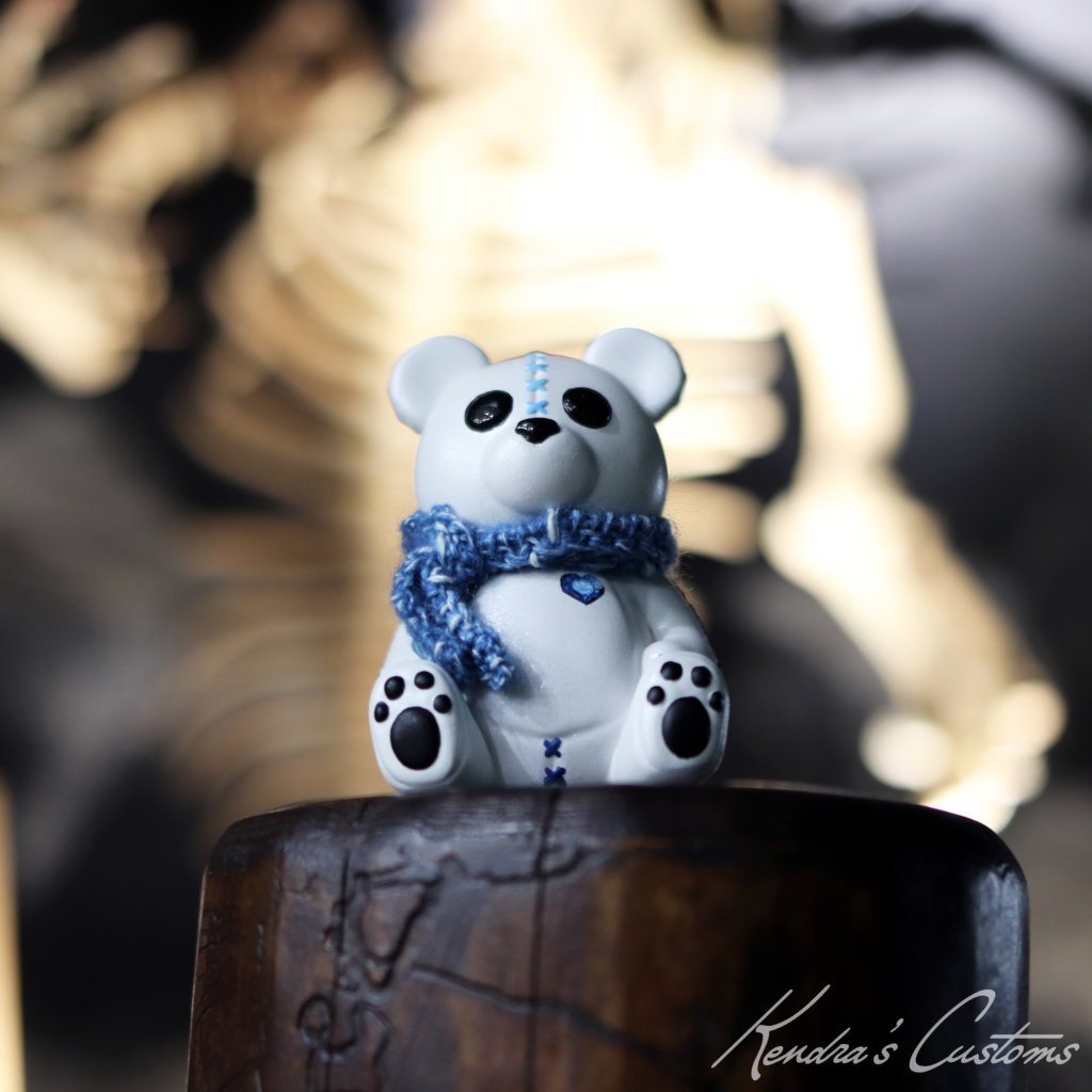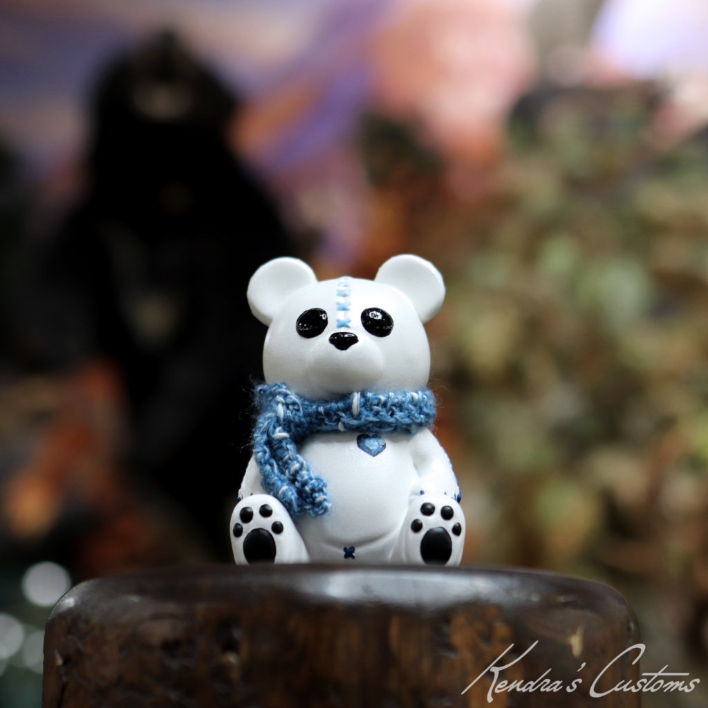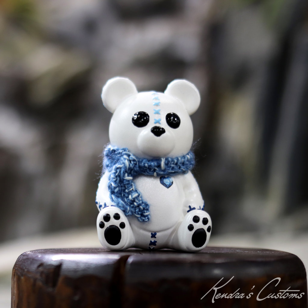 Polar Stitches is 4″ tall, hand cast resin, and all hand painted. He is a sparkly pearl white, has ombre blue stitches, and is adorned with a hand painted blue crystal heart. Each Polar Stitches will come with a handmade blue scarf, and each scarf
