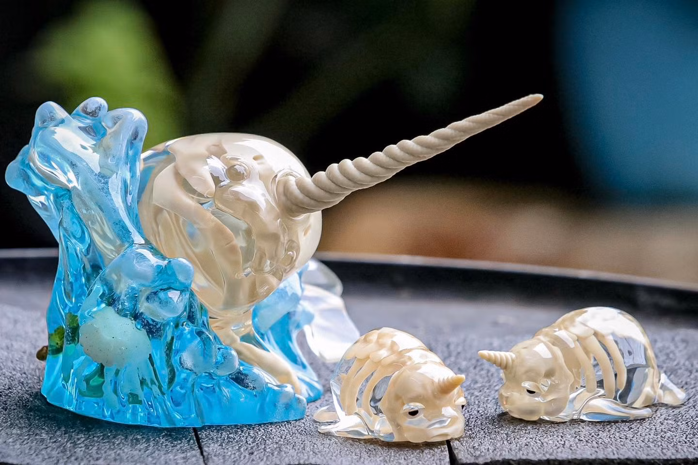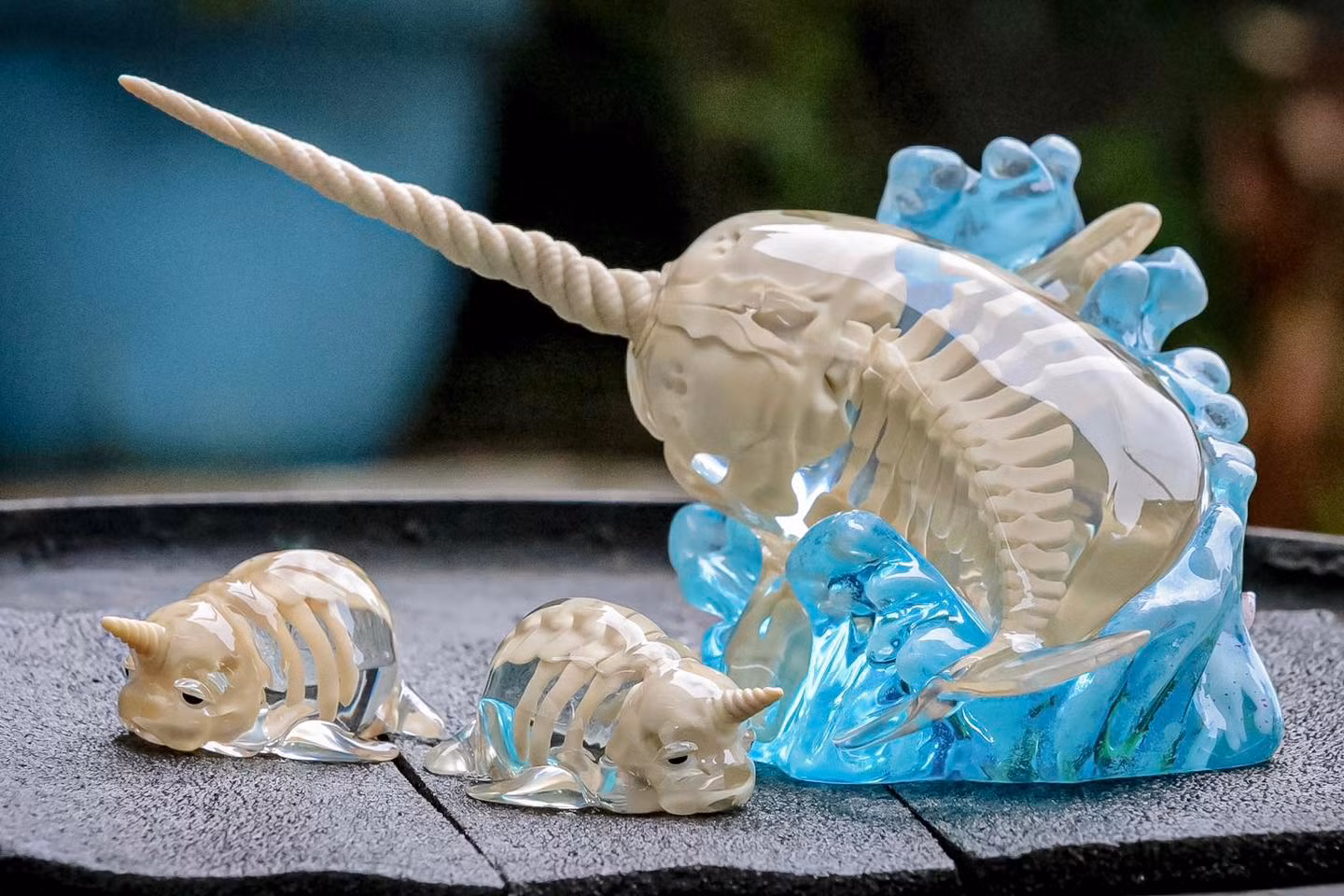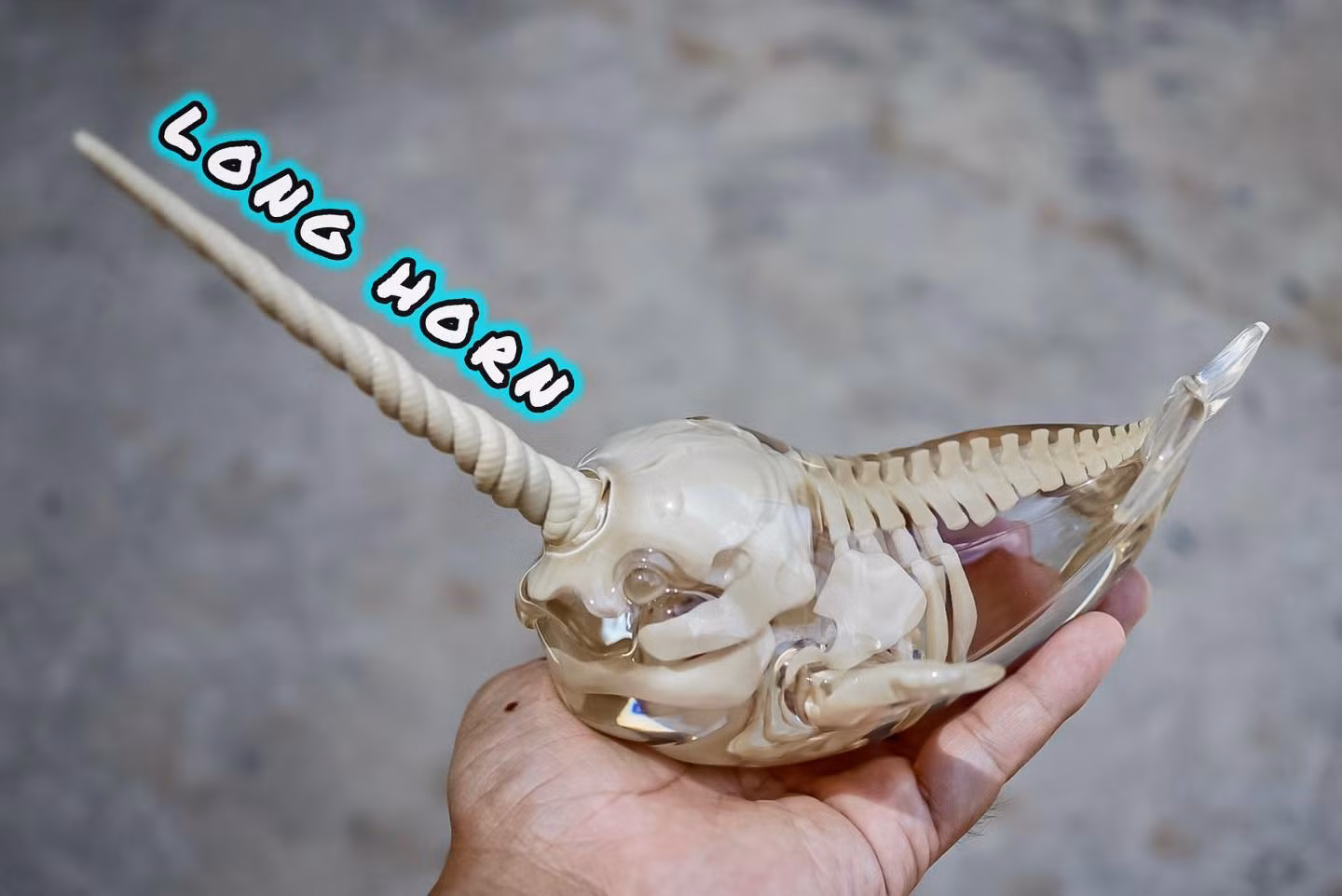 After months of teasing, TODAY is the day as Thailands TCS Arts Chawalit Siribundasak who brought you all the fantastic ” Shark Fat’tack” Daddy Shark and Baby Shark Shar-bly, plus that original Blue Whale Laboon and Long Tooth Walrus has given birth to a range of Narwhal’s! Making big waves once again with Narwhal and baby editions with that signature double casting showcasing the skeleton.