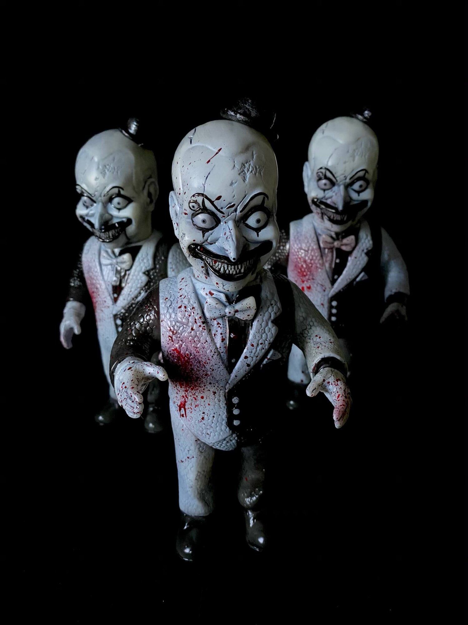 Two micro runs are available, 3 pieces with blood splatter and 3 without. Includes magnetic removable resin hat accessory and puppet victim. GID base vinyl painted by Miscreation.