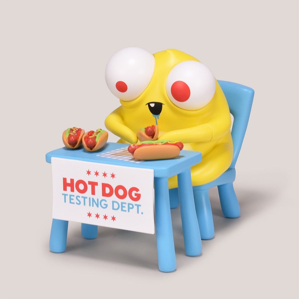 This tubed meat tester is prepared to parse piles of pigs parts & beef bits (or whatever else might be in there). Limited edition vinyl figure set was produced in an edition of only 50 pieces, and comes complete with Posterior Platform (chair), Experiment Support Surface (table), and Test Matter in the form of four mini Chicago-style hot dogs. These are now sold out online, but you may be able to find a set in person at Rotofugi in Chicago!