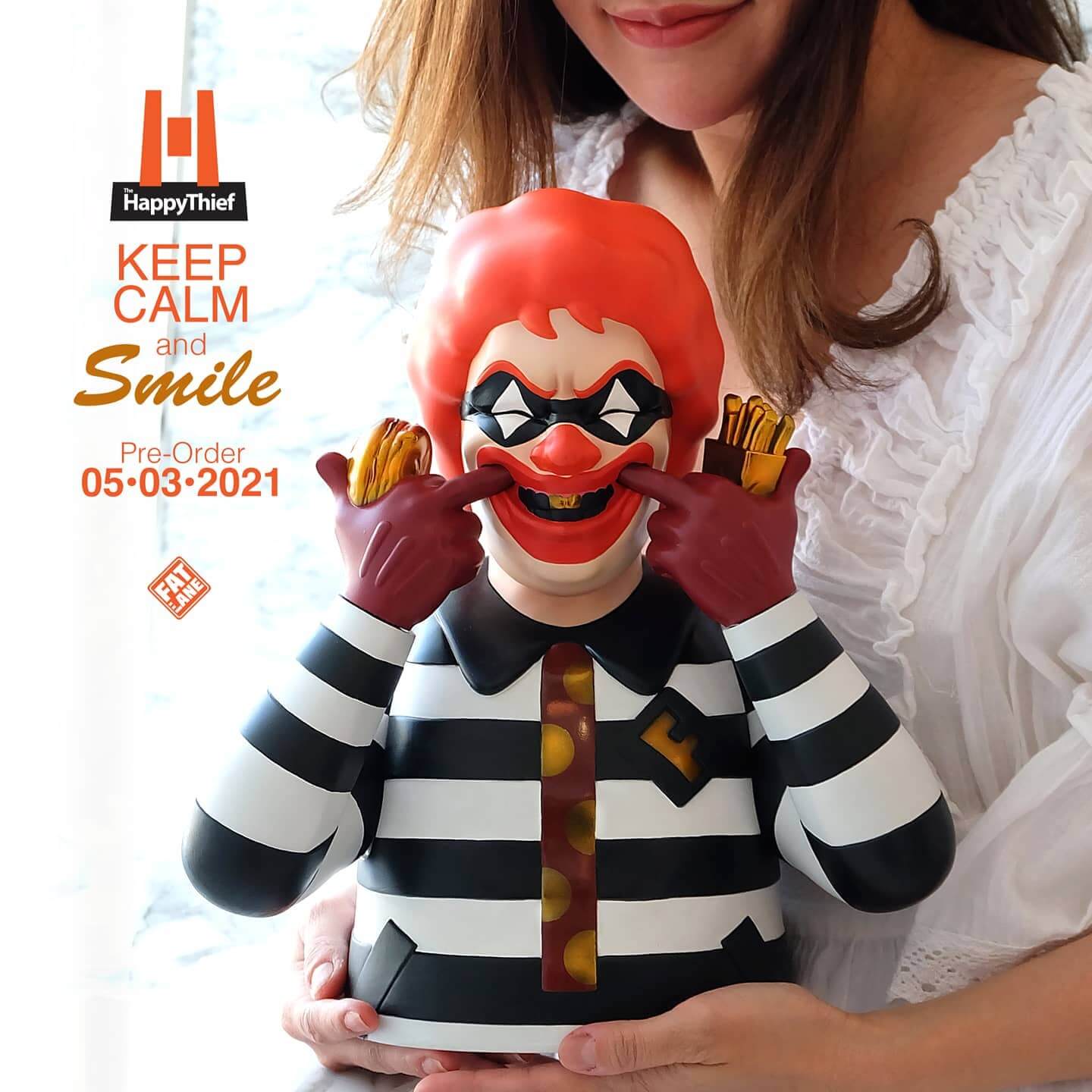 Those guys at FatLane are back at it like a crack addict! serving you up the new instalment! The encore is here, last year’s runaway success The Happiness Man. From the studio who brought you, “iWizard” comes the second mashup! Thailands “FatLane” presents The Happy Thief. During these dark times, one can only make themselves smile right? HA. What a mashup from FAT LANE! Why so serious? Even though we don’t normally collect bust this one ticks our boxes. Ron Vs The Hamburglar colourway with a Joker spin HA. Lovin the little touches like the missing tooth and the middle fingers. Can you see how much FatLane has fed The Happy Thief? he’s GROWN compared to The Happiness Man.