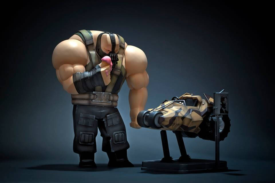 Amazing concept work. The way Bane is sculpted, with a melting ice cream on his hand, and the childish posture looking at a ride that’s clearly too small for him, it’s almost a statement to the inner child that is in all of us (even the on more badasses). One powerful image that makes this one of the best instalments in the series so far.
