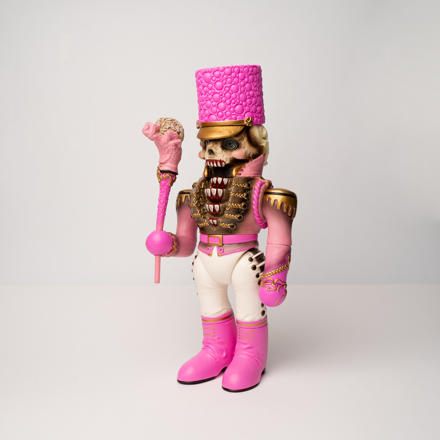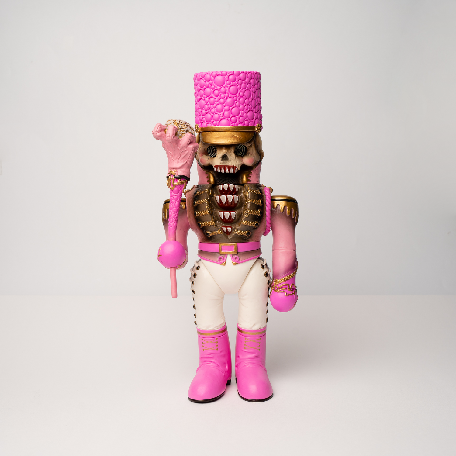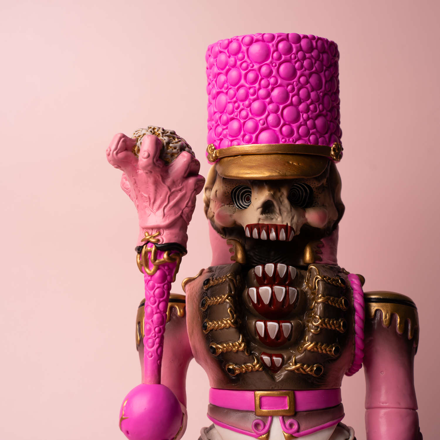 The NUTCRACKER by Nomiwa is a bold reinterpretation of the traditional toy soldier transformed into a haunting, candy-coated figure. Drenched in vibrant pink tones and accented with metallic gold details, this piece juxtaposes playful colour with eerie anatomical elements.