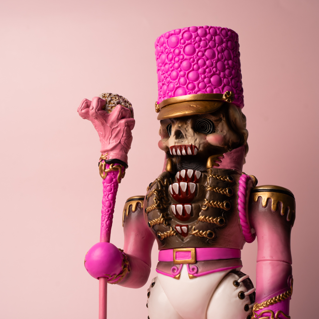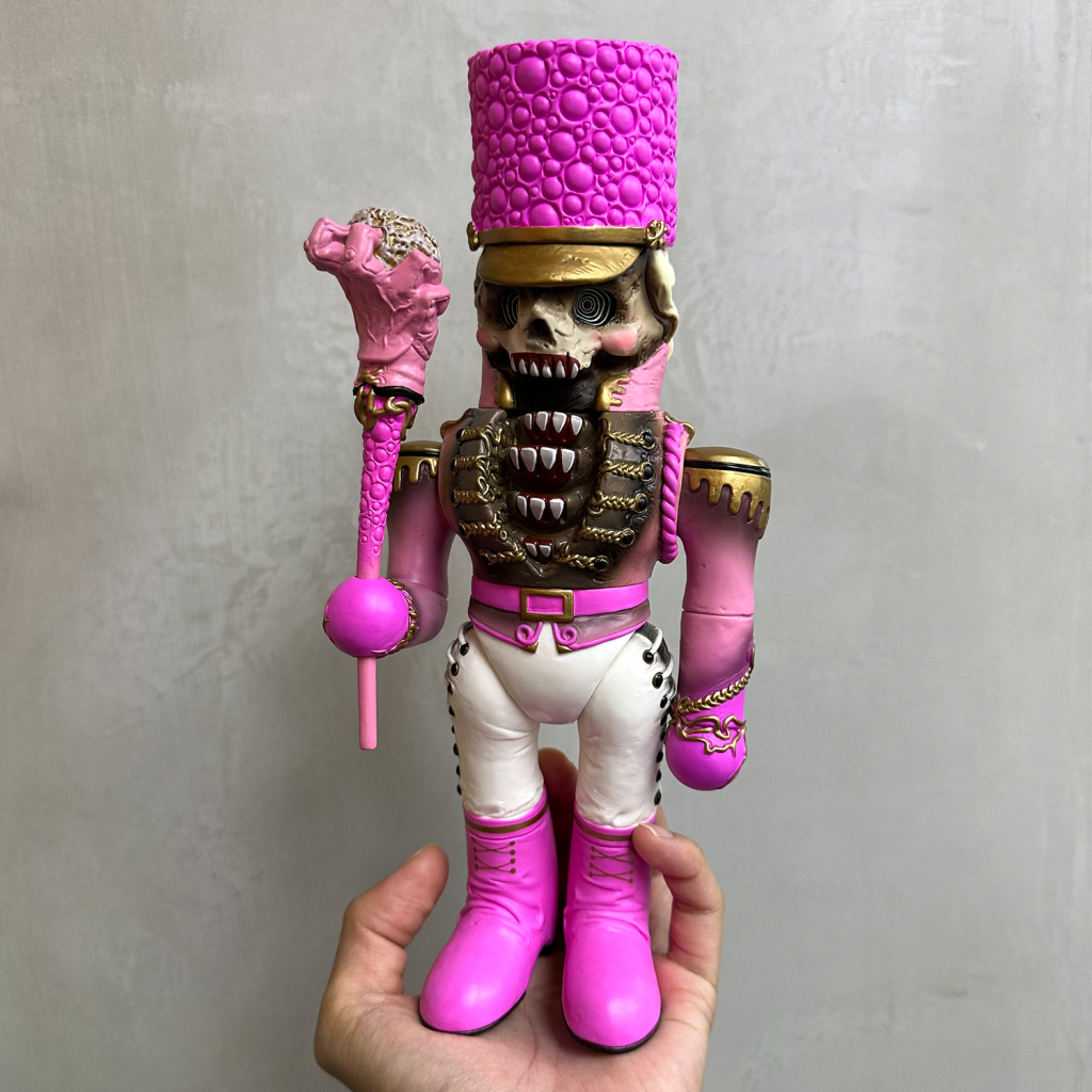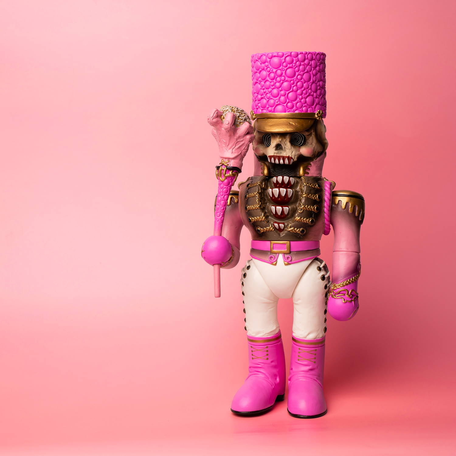 The NUTCRACKER by Nomiwa is a bold reinterpretation of the traditional toy soldier transformed into a haunting, candy-coated figure. Drenched in vibrant pink tones and accented with metallic gold details, this piece juxtaposes playful colour with eerie anatomical elements.