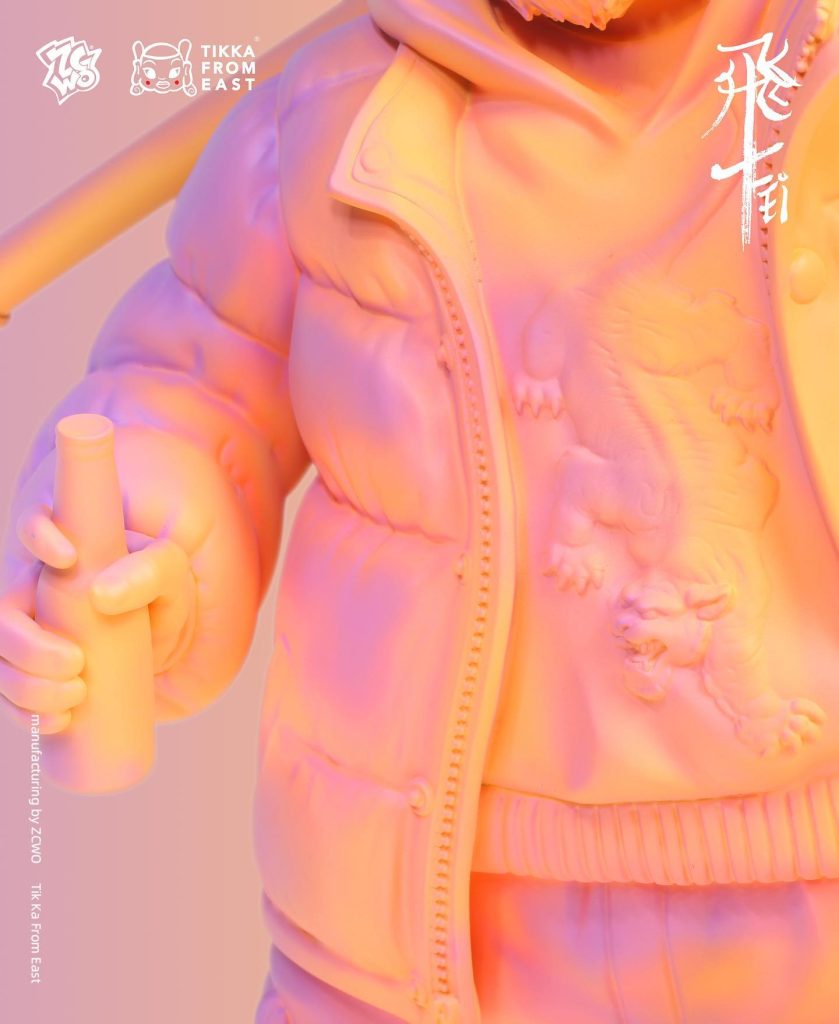 In 2021, “ Chiu Lau – Fei”, the second work of the Series which represents “courage” will be on stage. Fei resembles Cheung Fei in Three Kingdoms. The 55cm-tall figure presents Fei with masculine and bold imagery wearing a thick down, sports shoes, and a hoodie with a tiger icon. Holding the spin weapon as well as the wine bottle, Fei is a combination of the past and the present.