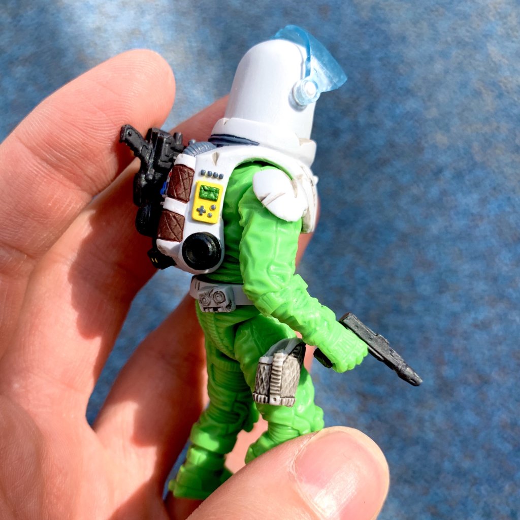 This hand-cast and the painted toy is 3 inches tall, features 6 points of articulation, including ball-jointed head, swivels in the arms and legs, and rotating waist. As for accessories, he has a pistol and a flashlight, which could both be stored on his armour. His helmet is removable, it’s visor articulates, and even the chest armour could be detached to reveal the undersuit. Each figure comes individually packed in a resealable blister card.