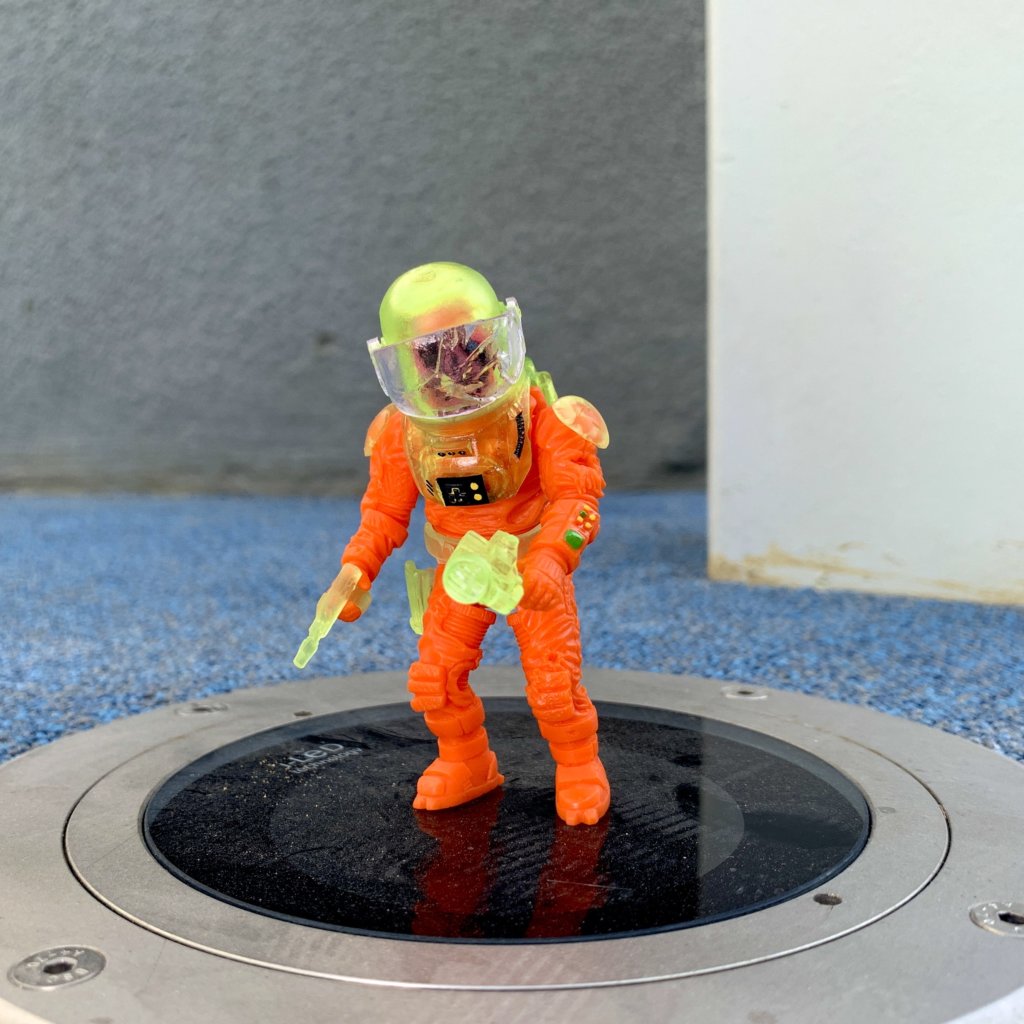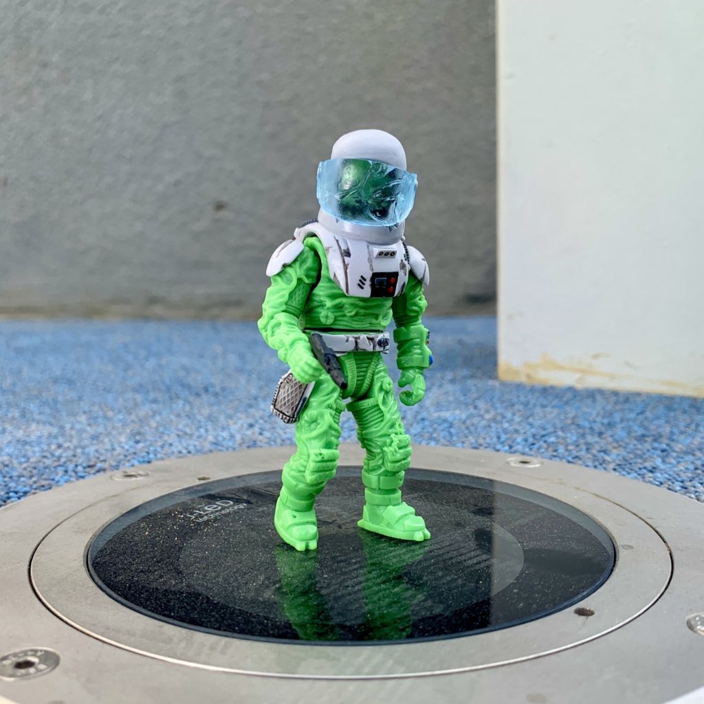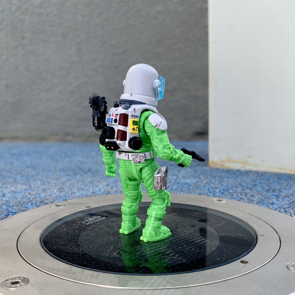 This hand-cast and the painted toy is 3 inches tall, features 6 points of articulation, including ball-jointed head, swivels in the arms and legs, and rotating waist. As for accessories, he has a pistol and a flashlight, which could both be stored on his armour. His helmet is removable, it’s visor articulates, and even the chest armour could be detached to reveal the undersuit. Each figure comes individually packed in a resealable blister card.