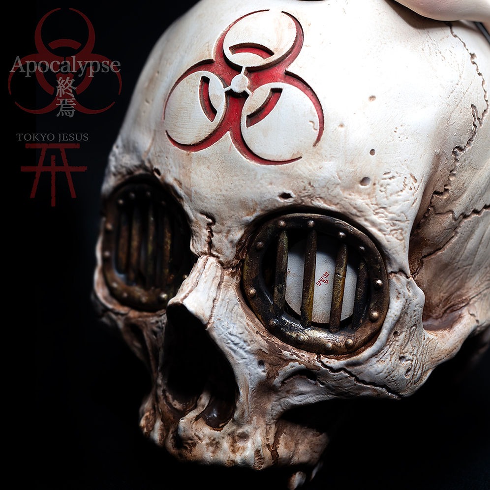 This piece features a multi-eyed gas mask and barred eyes, with the skull as its central theme. Material: Lacquer Painting, Enamel Painting, Acrilic Painting, Urethane resin