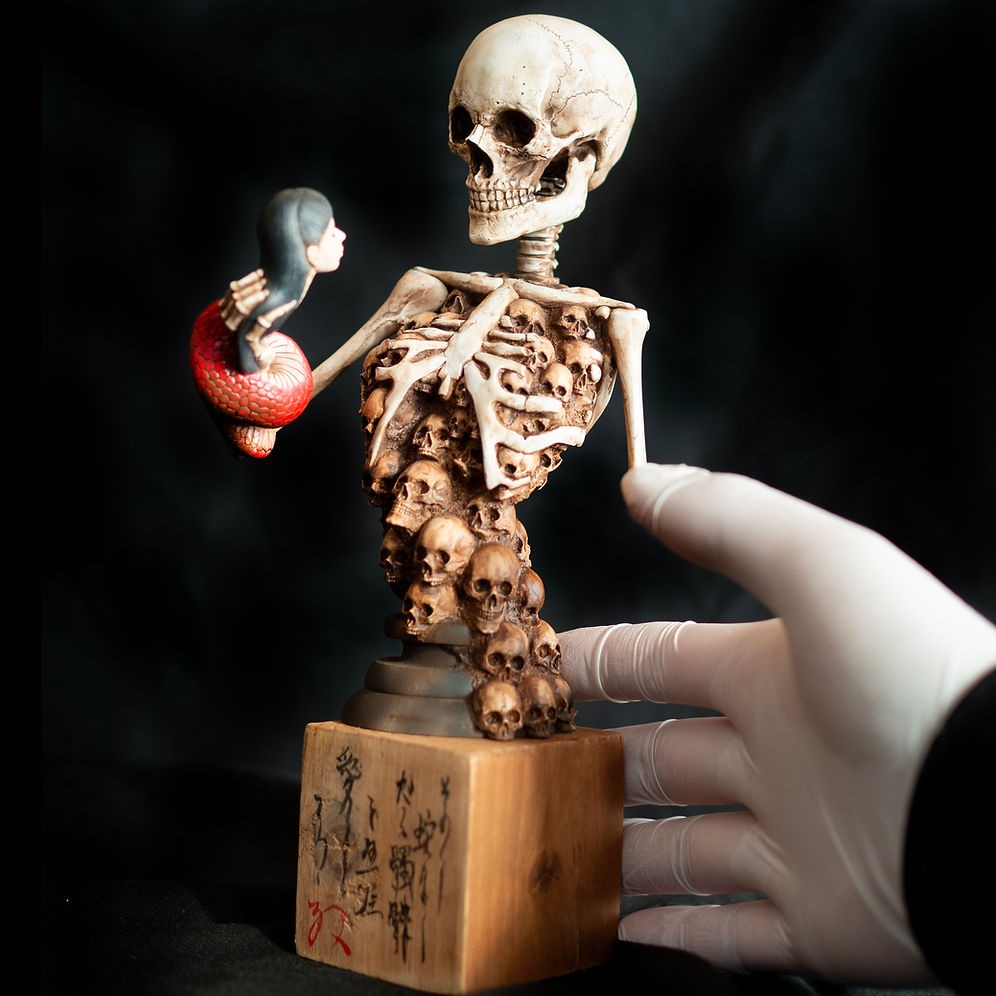 A statue adaptation of the iconic female figure seated on a skull, a recurring motif in Tokyo Jesus’s early sculptural works.