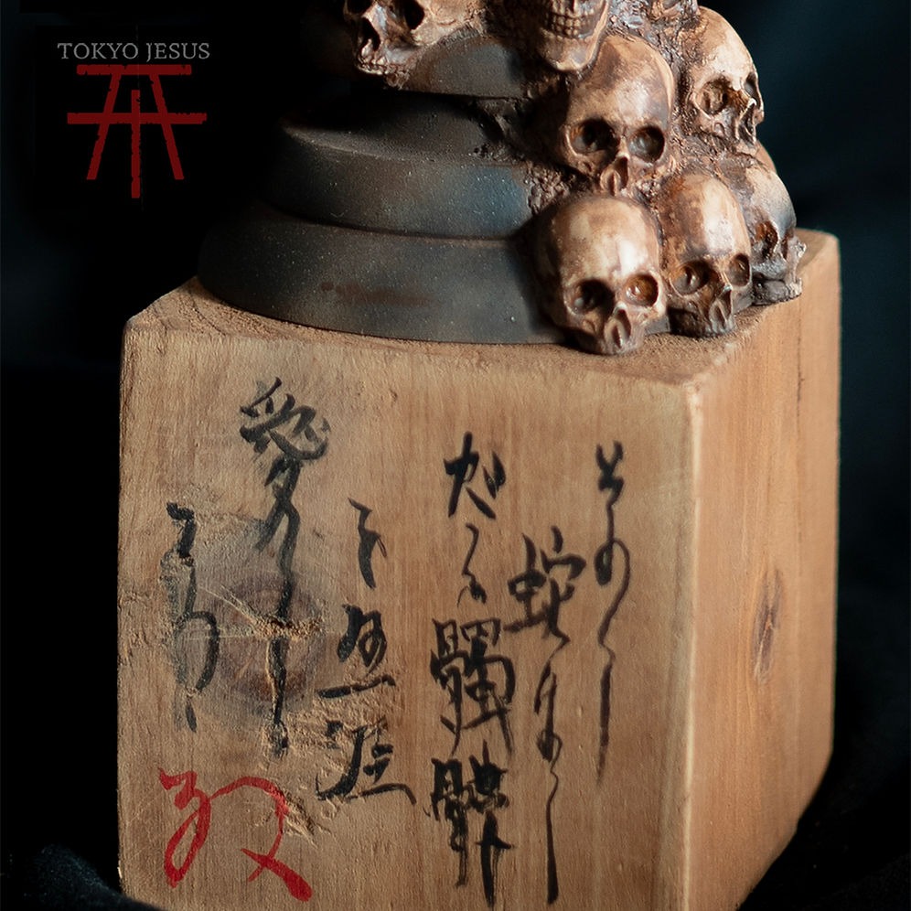 The wooden base features calligraphy in old Japanese, drawn by Tokyo Jesus.