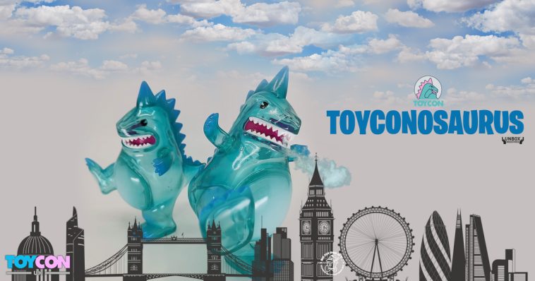 With less than a week away, the tremors are getting stronger! YES ToyCon UK is BACK! London be prepared as the ToyCon mascot TOYCONOSAURUS is back with a stunning new colourway/edition making the ground shake! The homage to the classic TOYCONOSAURUS colourway, but now in this cool semi-transparent edition. It wouldn’t be right without a T-Con for ToyCon UK, right? Without further ado here comes this years T-con! Powered by the guys at Unbox Industries you already know these bad boys will be top production peices.