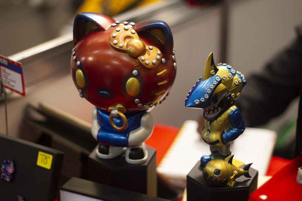 A little closer to home, Karmieh Designer Toys from Romania shared his booth with 2Petalrose. Although their styles differ, I thought they complimented each other nicely. Karmieh’s Hellbaby definitely gave me nightmares (in a positive way) and his character Foxpresso looked really clean. Hard to pick a favourite colourway for him as they both work well so you can take a look at the photos and try to decide for yourself. 2Petalrose also made it hard to pick a favourite with his insanely detailed pieces that sold out in a heartbeat, but his custom skullface Kit Katana figures are probably the ones that I’d go for.