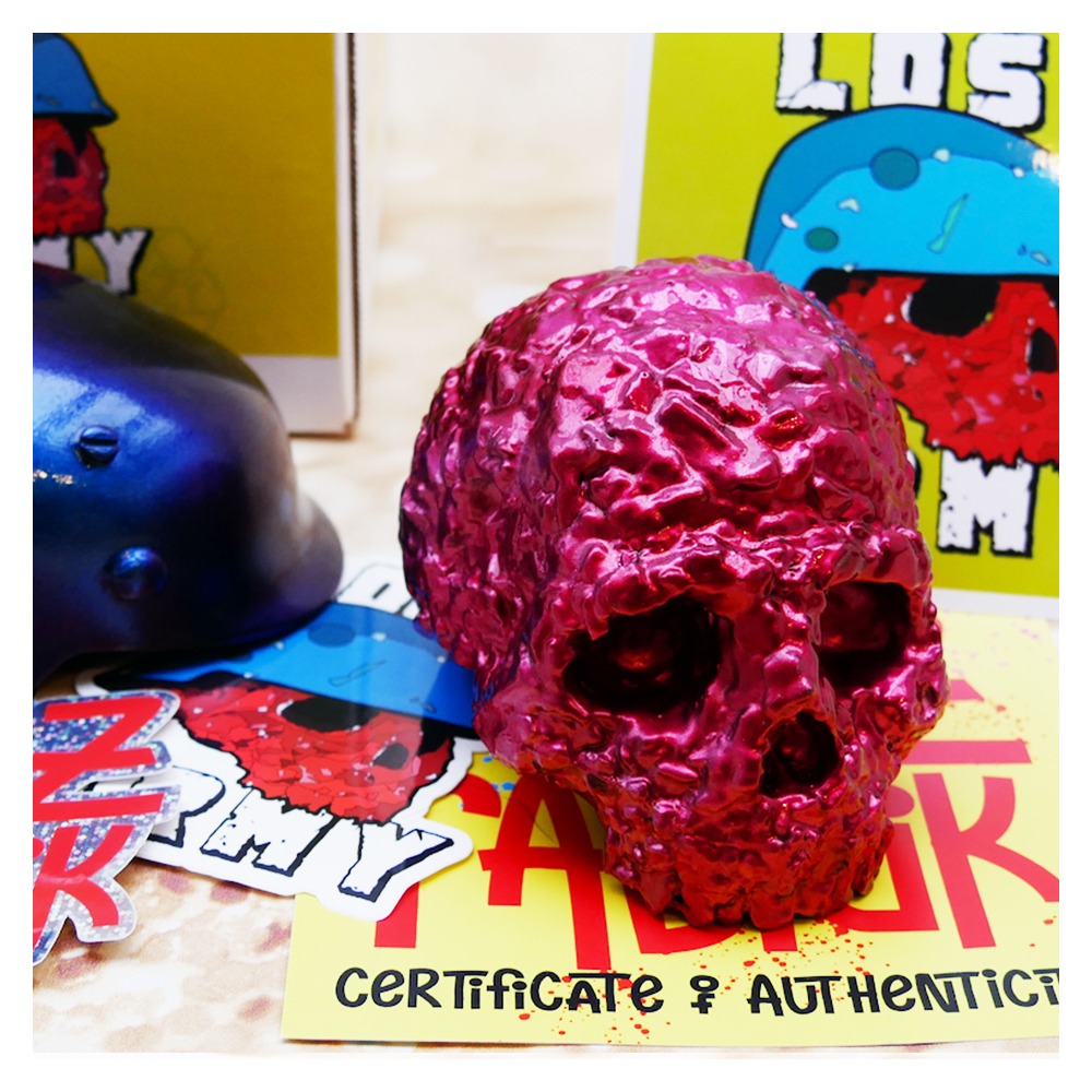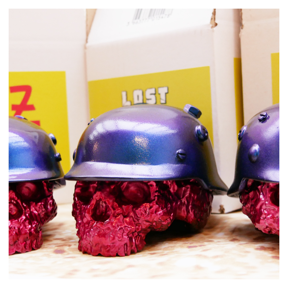 Belgium stand up! Belgium based TOYZFABRIK unearths his first-ever release and hopes to make his mark within the scene with “Lost Army” Toyzfabrik Presents His Lost Army. The Lost Army is made of resin and is in two parts, a skull and a helmet; these two elements can be separated. For this version, the skull is in red candy, and the helmet is in red-blue chameleon. Only three copies of This Soldier from Beyond the Grave are available.