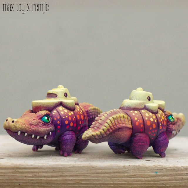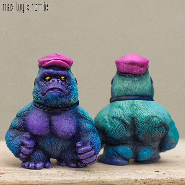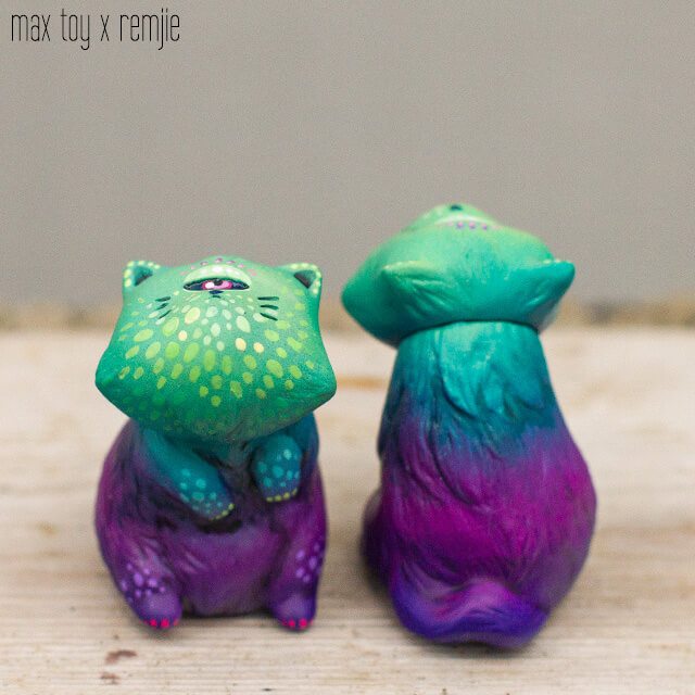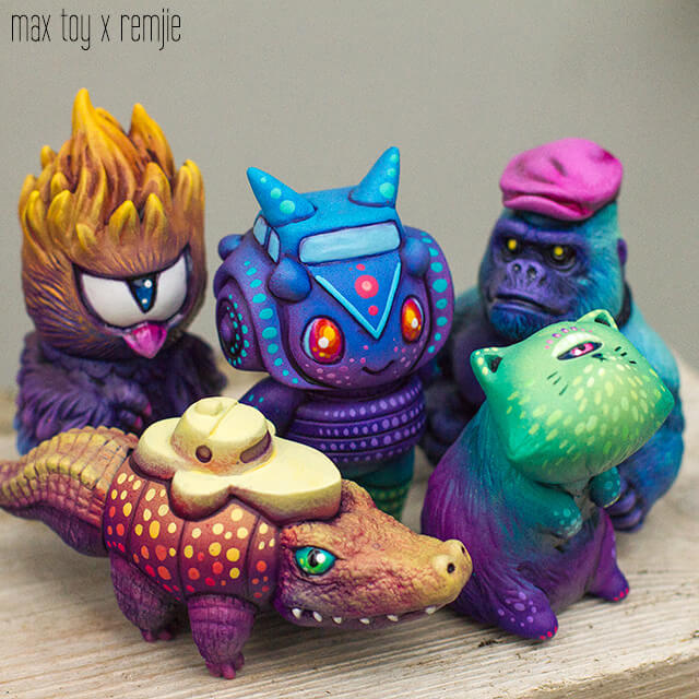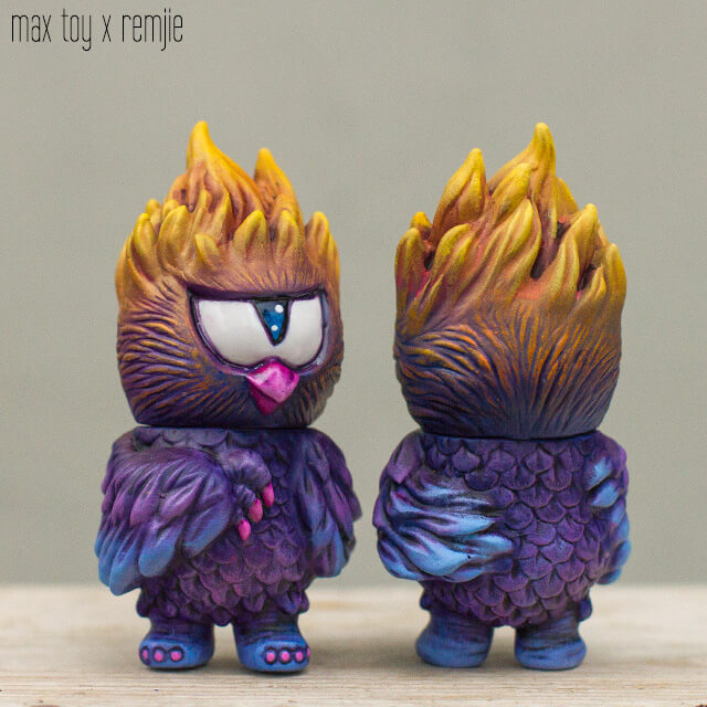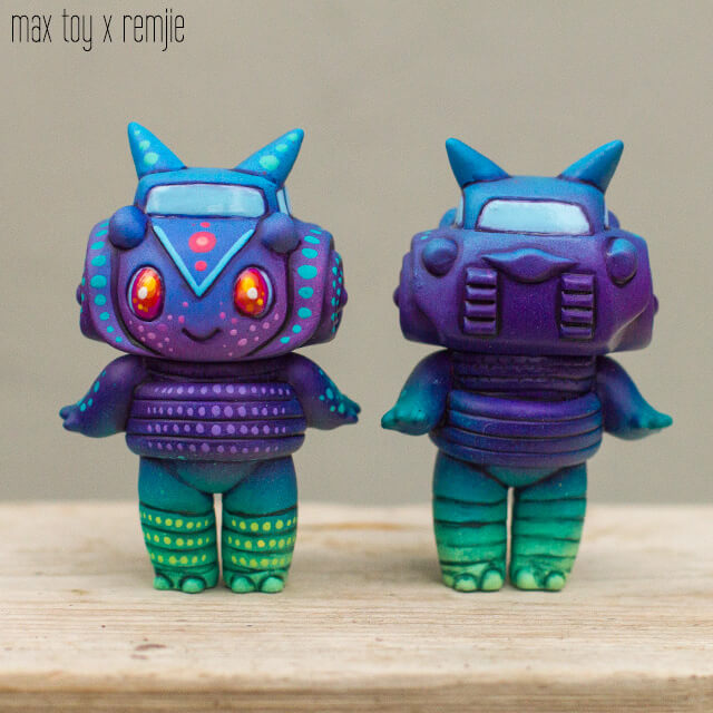 Remjie really making a name for herself over the past couple of years and today was a surprise release from her. A bright one at that. Remjie signature style and finish, wild deep purple runs deep within and every platform and character are blessed by the hand painted brush strokes of Remjie. Five cute and tiny sofubi toy designs created by Max Toy and painted by Remjie.