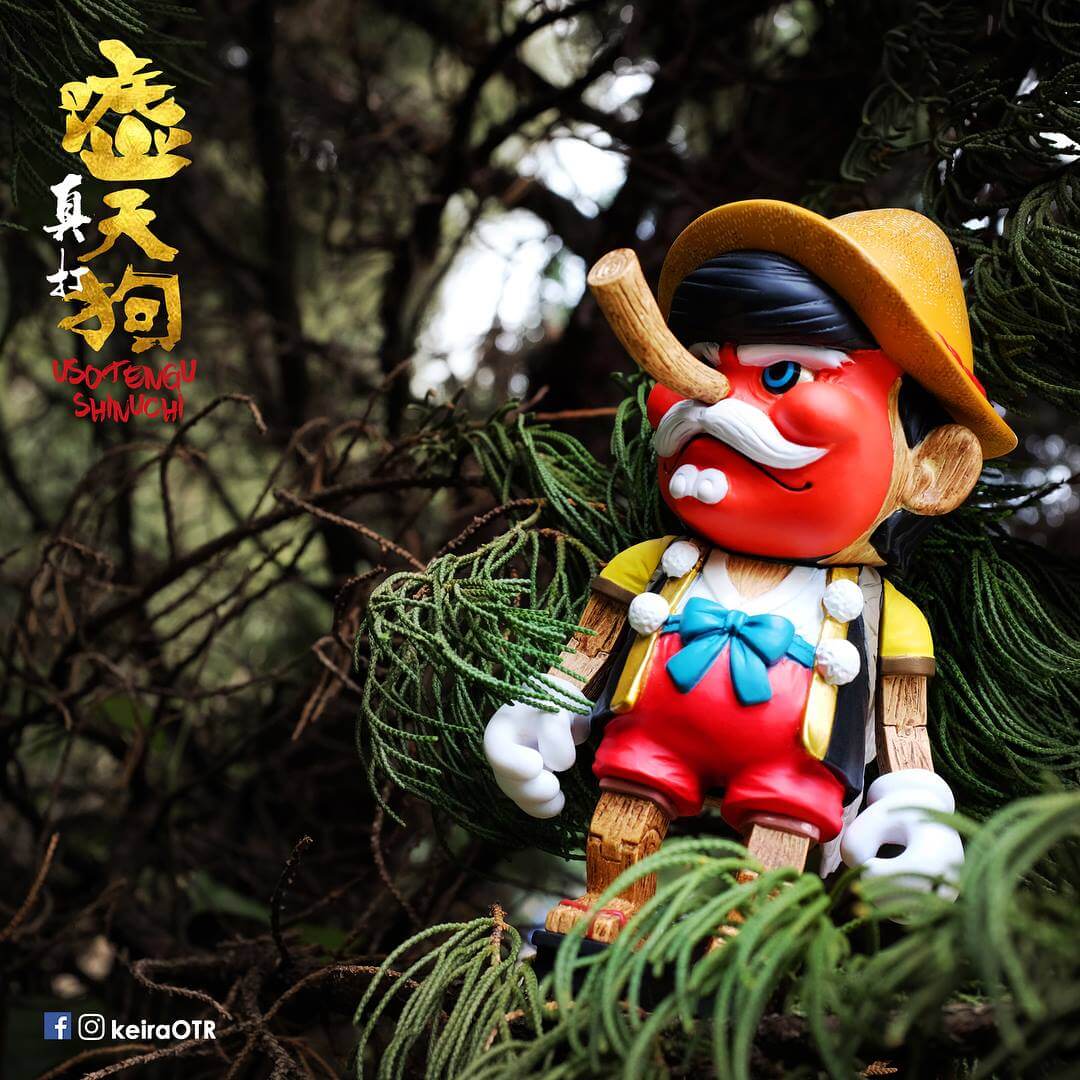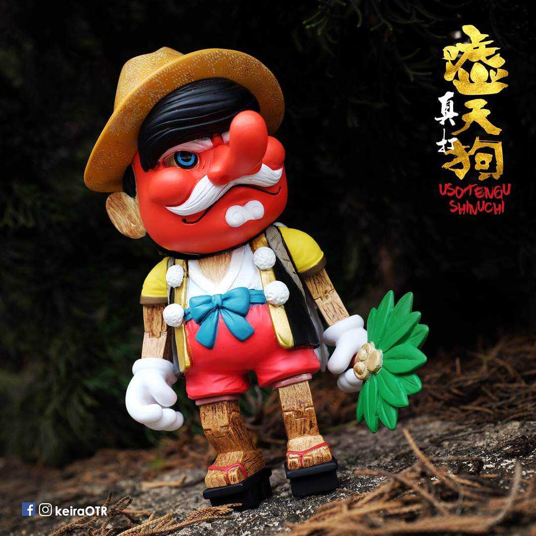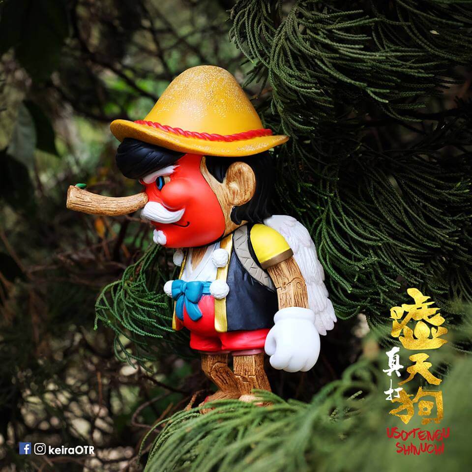 No lies! Hong Kong-based artist Keira On the Roof fantastic “USOTENGU” makes a short trip to Shanghai joining up with DEVIL TOYS x MERRY GO ROUND booth for Shanghai Toy Show 2018. KOTR Mix of Pinocchio with Tengu (legendary creature found in Japanese folk religion and are also considered a type of Shinto god) gets an all-new edition, USOTENGU Shinuchi STS edition! We are glad Kira has kept the wood effect on the arms and legs. Nice colourway possibly the best version we’ve seen! MULE PLEASE.