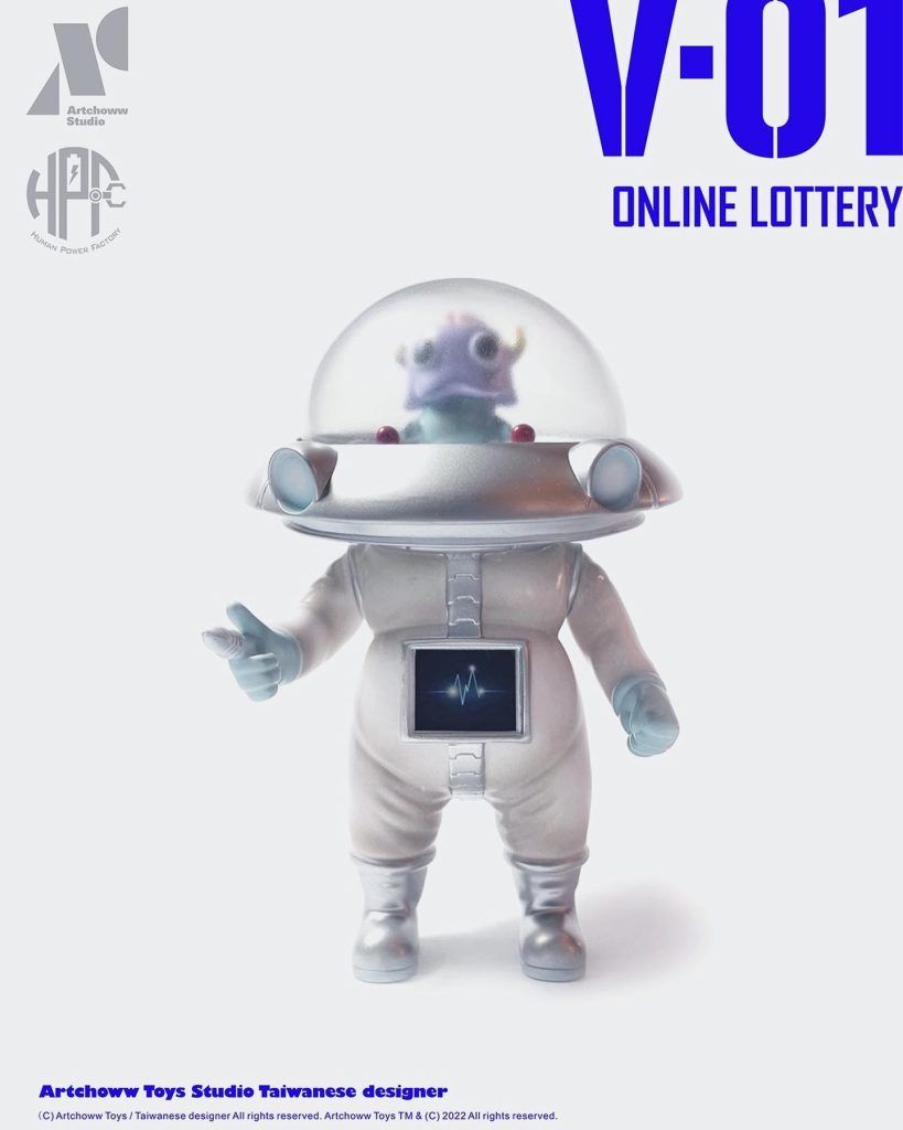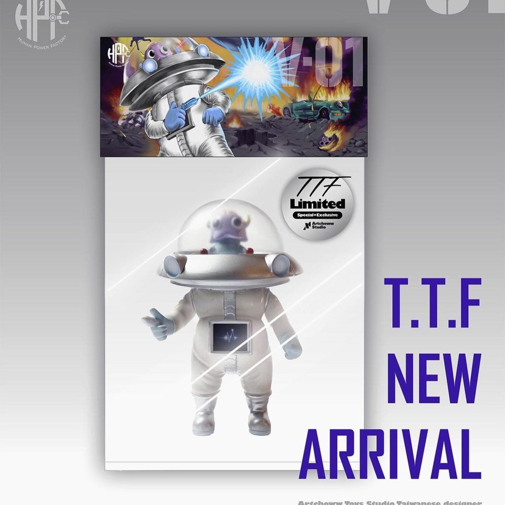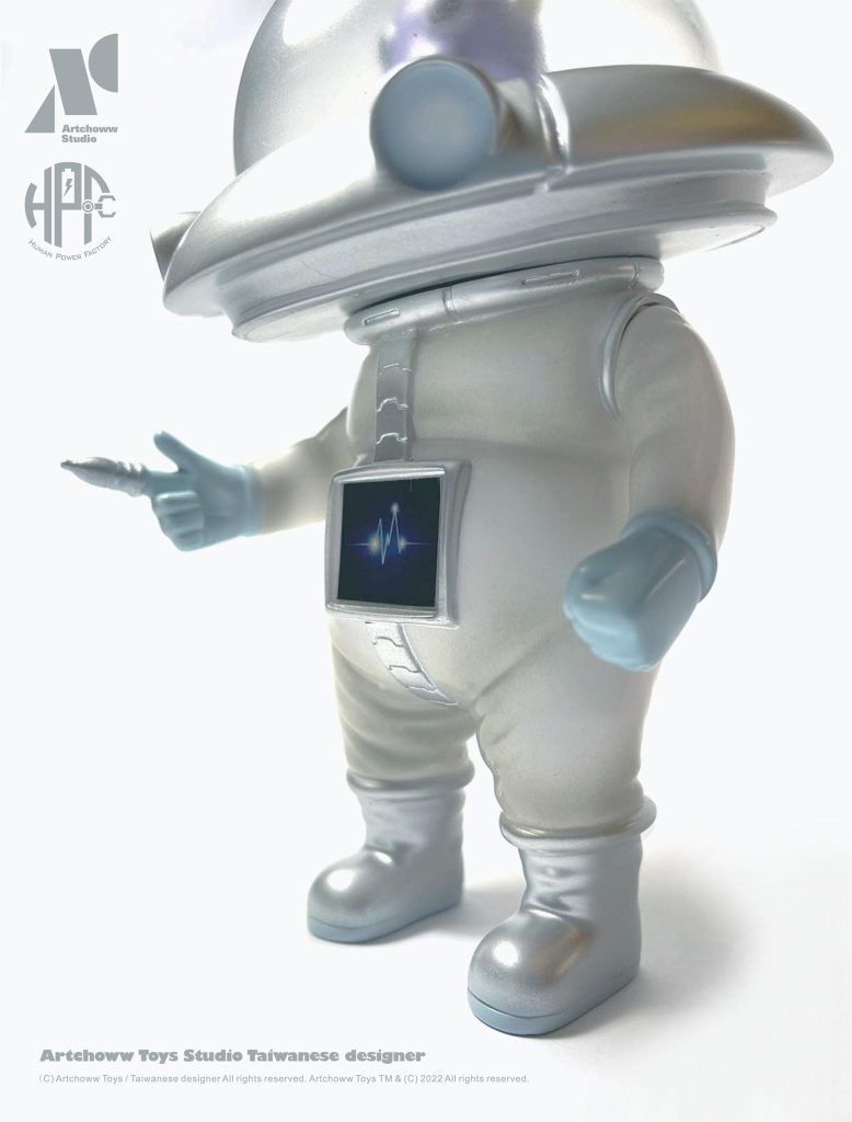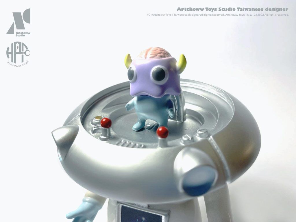 Evading the evil hands at TTF 2022 is a hand full of ArtChoww Toys ” V-1 UFO machine ” TAKE ME TO YOUR LEADER! First seen back in 2018, Liu Yu Hsuan the mastermind behind ArtChoww “Mr.LOFE” has come to take over your collection Powered by Human Power Factory! The INVASION is real as ArtChoww has unleashed a limited amount of the little chap. It’s been nice to see the development made into a soft vinyl version and now ArtChoww is giving you the opportunity to own one of the limited editions. Look out for that finger zapper, for the ones who don’t obey you know where that finger will end up! HA.