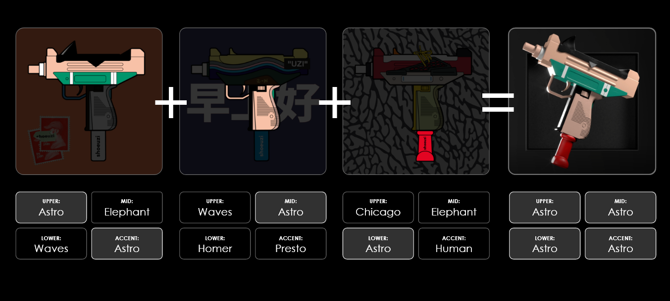 As we mentioned above, the NFT that Shoeuzi will release this week will be scattered/random rather than complete NFT. Each scattered NFT will contain four parts (traits) from 25 different Shoeuzi designs. If you collect all four traits for the same Shoeuzi (much like the diagram below) in your Metamask wallet, you will be awarded the complete Shoeuzi – in this case the Astro Shoeuzi.