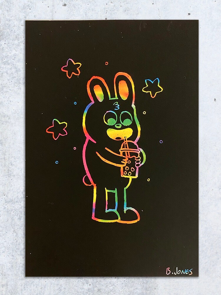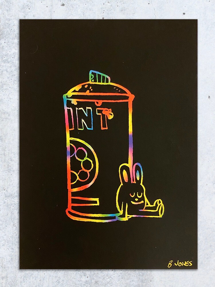 10 – large 20X20 pieces with each piece being accompanied by a matching hand-painted figure 30 – 5X7 original rainbow scratchboard drawings Edition of 15 Black Matted resin figure small edition of screenprints