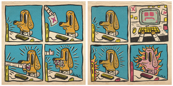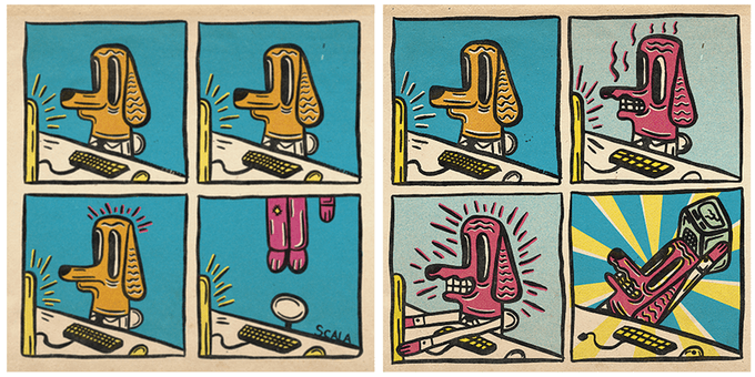 I have lived it, as I am sure many of you out there have aswell ! As an artist, I did the best thing I could and thatwas find a funny way to show these situations. They were not only therapeutic for myself but as I posted more on my Instagram (vincentscala ), I realised that there area-lot of people who have felt the same way and could relate to Work Dog. He is anyone that has either had a tough boss, or a tough job in general. Like “Elf on a Shelf”, Let’s help spread the “Dog on a desk”. – Vincent Scala