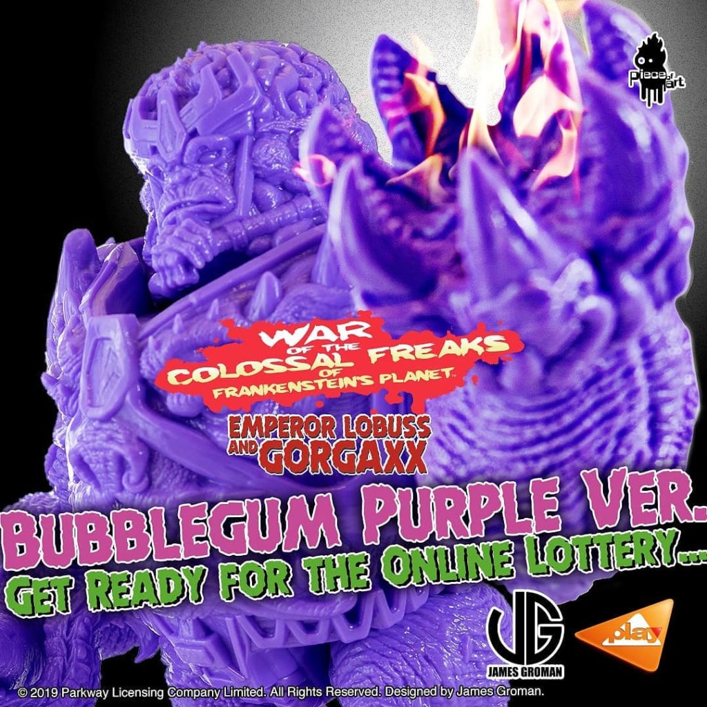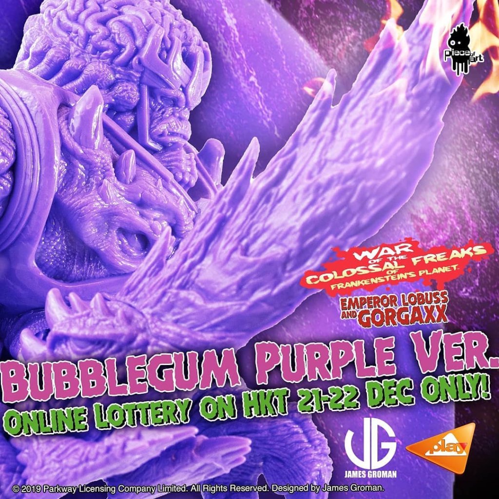 The ground is shaking! Make way for the return of “War Of The Colossal Freaks of Frankenstein’s Planet (WOTCFOFP)” – Emperor Lobuss & Gorgaxx by James Groman x PlayToy! This time even Thanos would be jealous of the Purple what WOTCFOFP Emperor Lobuss & Gorgaxx possess, Ha. War Of The Colossal Freaks of Frankenstein’s Planet (WOTCFOFP) vinyl monster figure is a super-sized vinyl toy collaboration with James Groman. James is an experienced and well-known illustrator, Toy Designer and Sculptor. piece of art “WOTCFOFP” – Emperor Lobuss & Gorgaxx – BUBBLEGUM PURPLE Ver. Vinyl Figure will be launched via Online Lottery Sale ONLY.