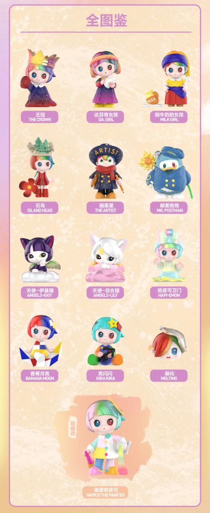 Japan-based artist Yosuke Ueno and POP MART reunited to present you with another beautiful Blind Box series! vol. 2, “The Art World”! features another colorful series and the concept of this series is inspired by masterpieces of world art. Yosuke Ueno’s signature character ” HAPICO” is reimagined in the world of art. This new ” The Art World” series features 13 (including secret) characters. HAPICO is joined by her friends like BONGO, JUPIER, LILLY and IGGY are all back for this new series too!