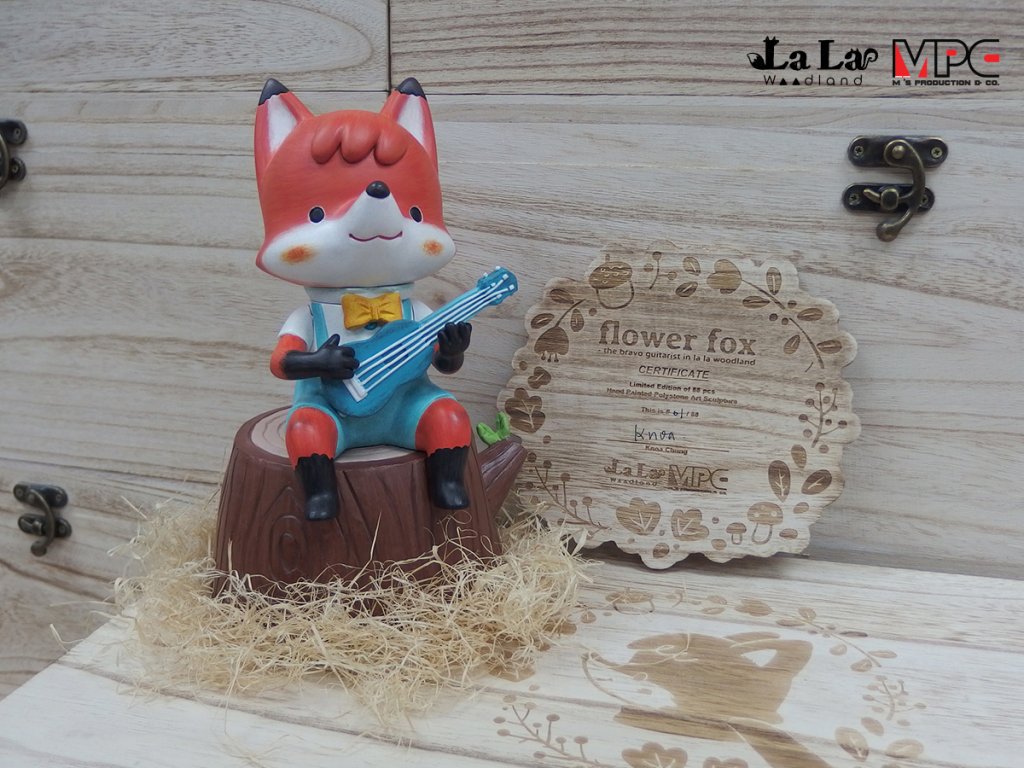 - box set completed with twelve (12) components – one (1) head, one (1) body, two pairs (4) of hands for sitting relax and playing guitar, one (1) tail, one (1) guitar, one (1) scarf, one (1) bow tie, one (1) tree stage and one (1) of hand made woolen scarf for flower fox.